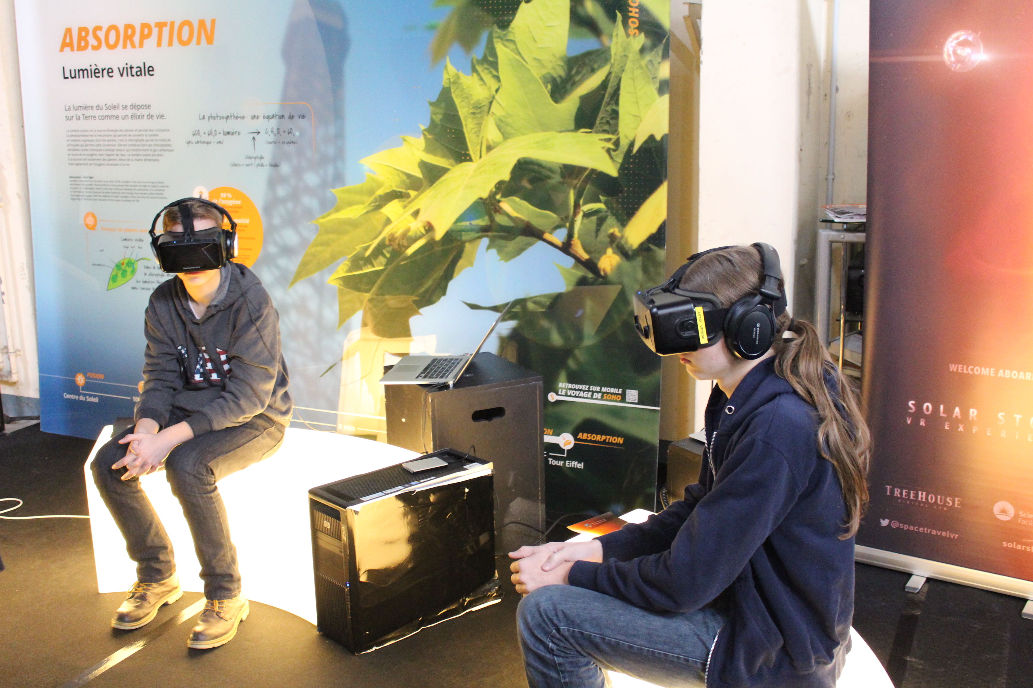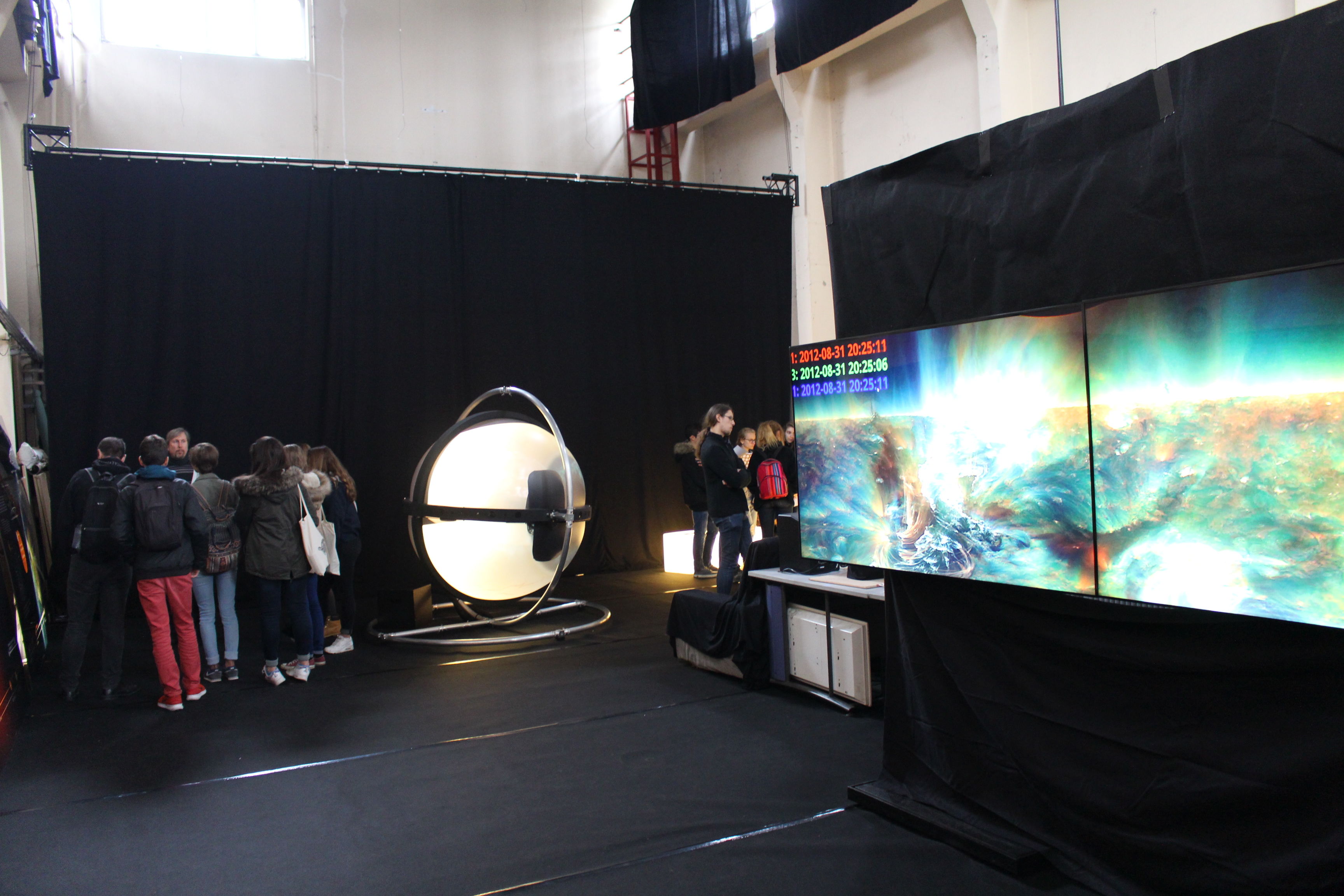 FLARECAST project members Frédéric Baudin and Eric Buchlin were very involved organizing and carrying out this event. The sun was very well represented. Frédéric had a talk about ‘the Sun and its cousins, the stars’, and Erics wonderful solar limb movie was shown on two very big screens (see image below and check out the movies on YouTube – they are fantastic). Visitors had the opportunity to experience a solar storm watching a VR-movie developed by Miho Janvier and Tom Saville. A set of big posters from the exhibition ‘L’Odyssée de la Lumière’ at Cité des Sciences in Paris, explaining the journey of a photon from the centre of the Sun to the Earth, complemented the experience.