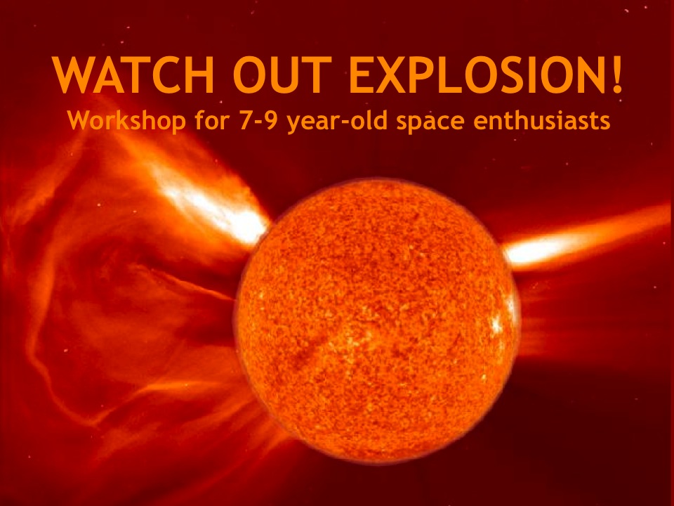 This workshop is all about explosions on the Sun. We offer it for 7-9 year-old children, guiding them from directly looking at the Sun with eclipse glasses through observation with, firstly, simple, then more sophisticated telescopes and finally satellite images, always in search for explosions. During the two hours workshop, kids create their own magnetic Sun with sunspots, magnetic loops, explosions and solar storms.