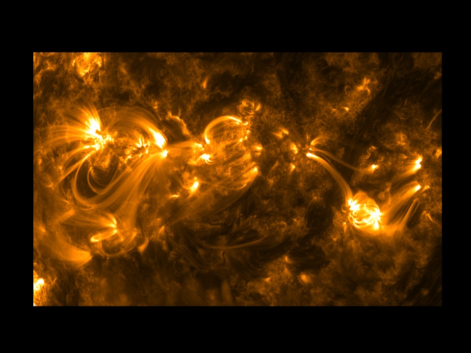 - We can see completely new things. (Have kids describe) We can see now what is going on near the sunspots where the magnetic forces are strong. There are loops reaching from one spot to the other. Let‘s get closer.